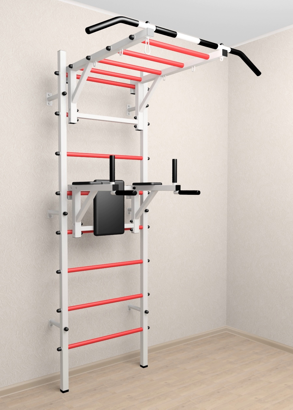 Стойки шведской стенки Sv Sport стандарт изготовлены из профильной трубы 40 х 40 х 2 мм. Ступени изготовлены из круглой, стальной трубы, покрытой резиной (не скользят, не натирают мозоли, не прокручиваются, не имеют запаха, приятны на ощупь). Устанавливается к стене при помощи 6 кронштейнов. На перекладину, в местах хватов, одеты резиновые ручки.