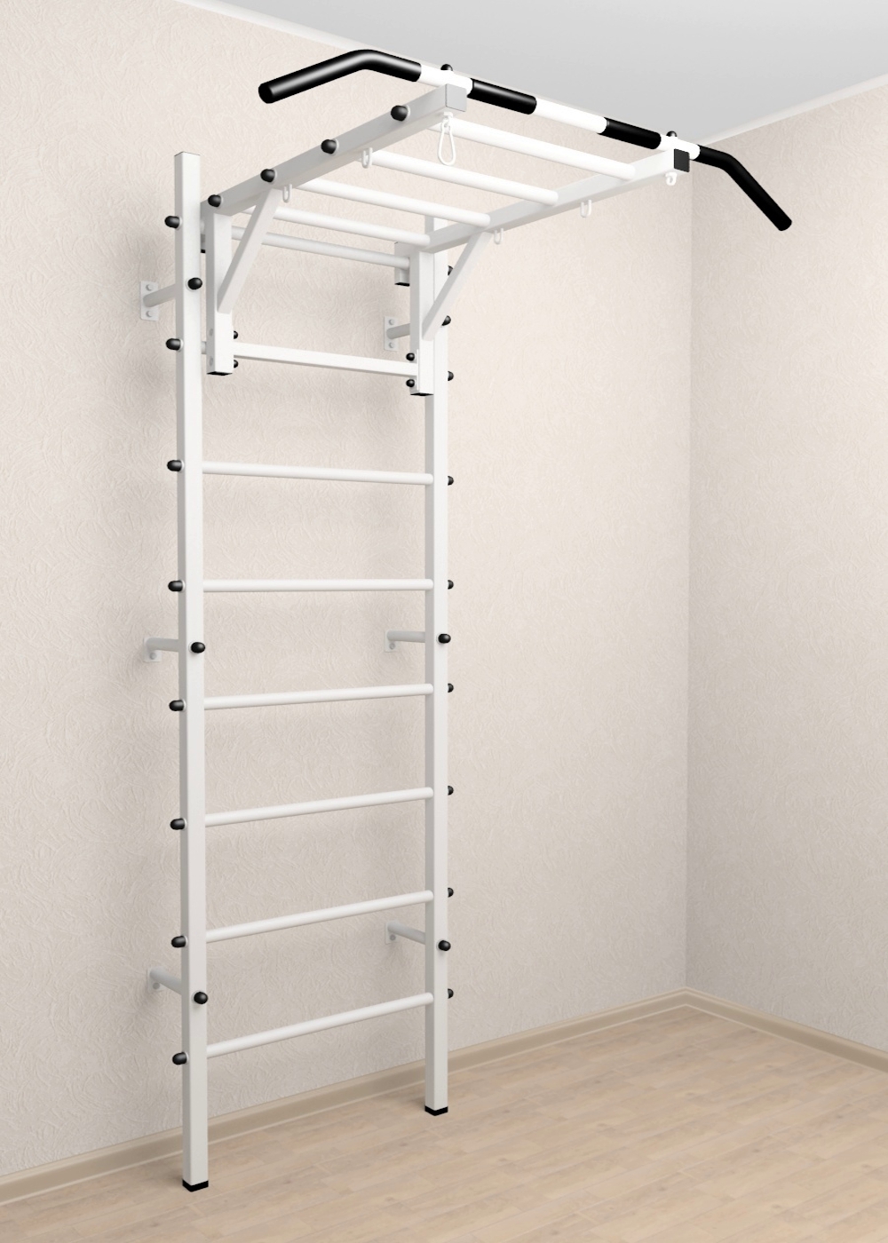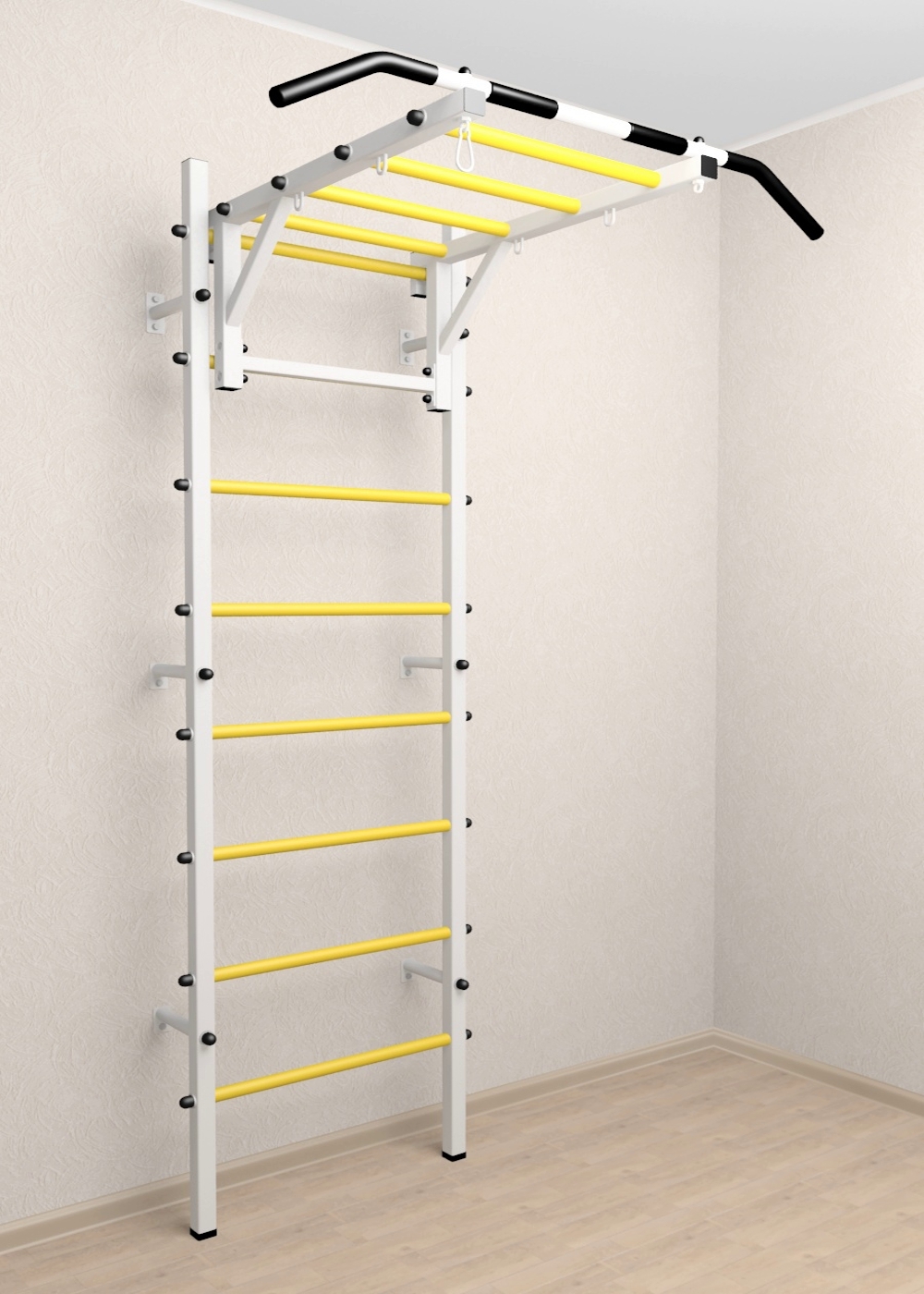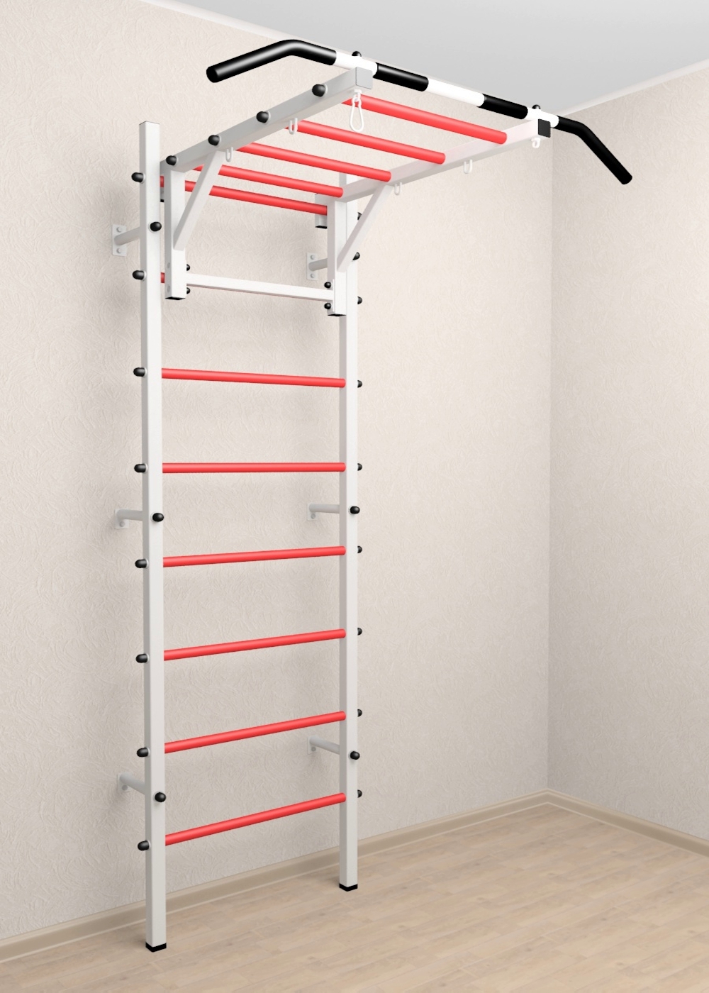 Стойки шведской стенки Sv Sport стандарт изготовлены из профильной трубы 40 х 40 х 2 мм. Ступени изготовлены из круглой, стальной трубы, покрытой резиной (не скользят, не натирают мозоли, не прокручиваются, не имеют запаха, приятны на ощупь). Устанавливается к стене при помощи 6 кронштейнов. На перекладину, в местах хватов, одеты резиновые ручки.