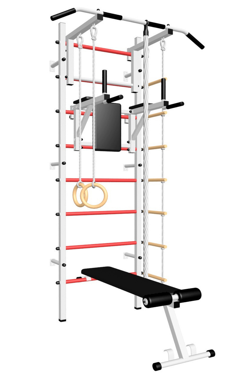Стойки шведской стенки Sv Sport стандарт изготовлены из профильной трубы 40 х 40 х 2 мм. Ступени изготовлены из круглой, стальной трубы, покрытой резиной (не скользят, не натирают мозоли, не прокручиваются, не имеют запаха, приятны на ощупь). Устанавливается к стене при помощи 6 кронштейнов. На перекладину, в местах хватов, одеты резиновые ручки.